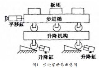 500機組加熱爐目前采用的是推鋼式出鋼,此種方式容易產生黑印、 粘鋼等弊端, 嚴重影響鋼材軋制的質量, 應改為目前為常用的步進梁出鋼方式。 步進梁式系統(tǒng)具有技術成熟、 出鋼高效等點, 其動作方式如圖1所示: